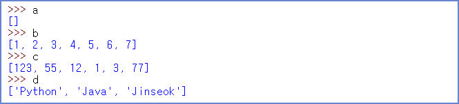 예를 들면 a[0]이면 첫번째 자리 수인 "Python"이 출력되는 것이다.