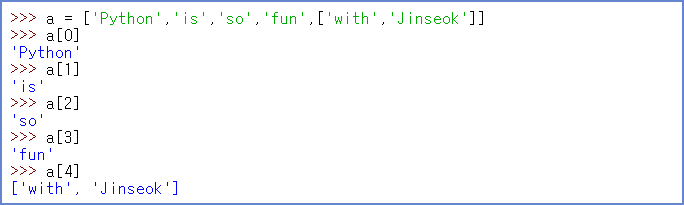 a[4]는 다섯째 자리의 리스트들.['with','Jinseok'], 괄호안에 있기 때문에 한번에 같이 출력된다.