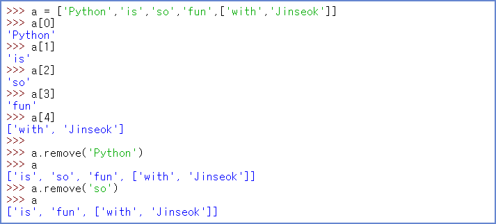 그러기 때문에 맨 위에 리스트인 [with,jinseok] 가 변수 a에서 빠져나온다.